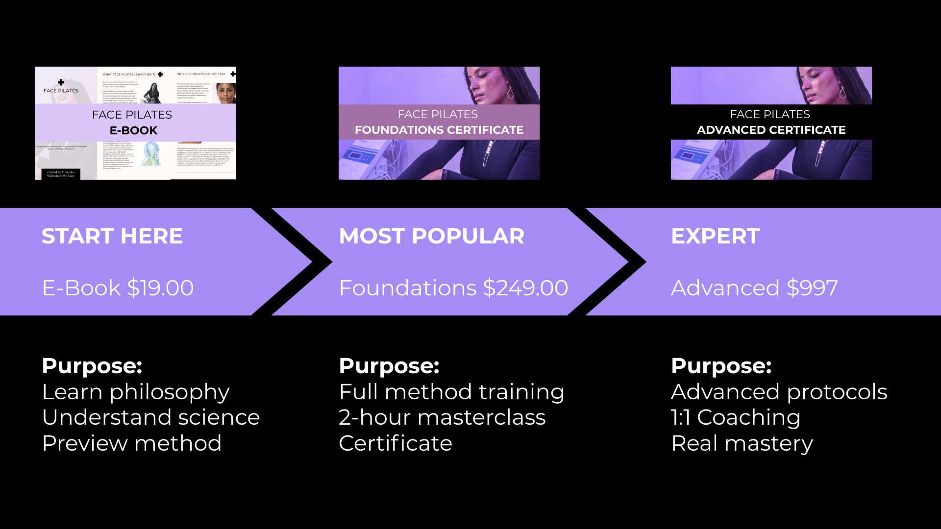 If you move up later, your previous purchase is credited toward the next level (e.g., the $19 E-Book is deducted from Foundations, and Foundations is deducted from Advanced).
